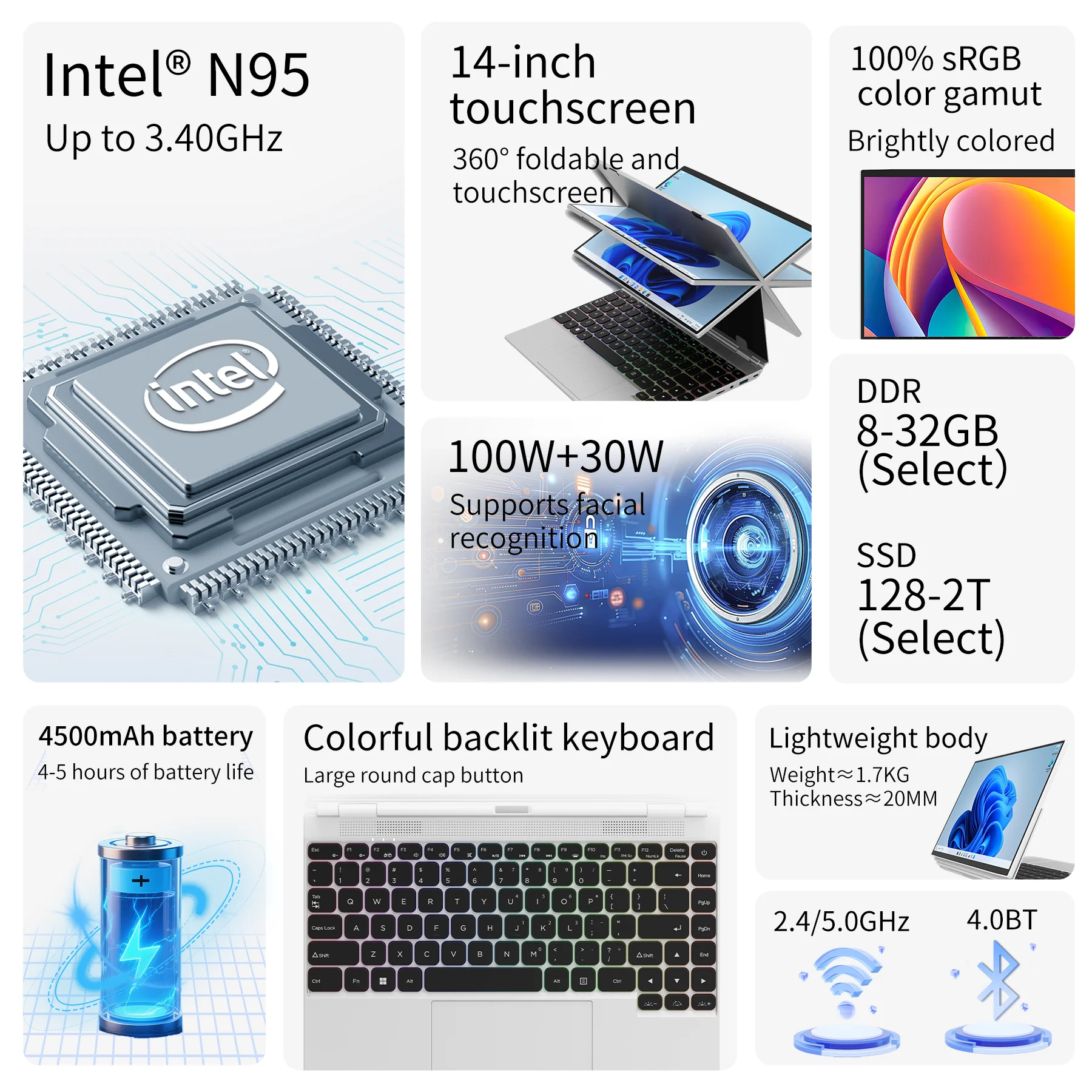 New 14.1 Inch Intel N95 Quad Core 3.4GHz 32GB RAM 512GB SSD 1920×1200 16:10 IPS 60Hz Display Windows 11 Touchscreen Laptop